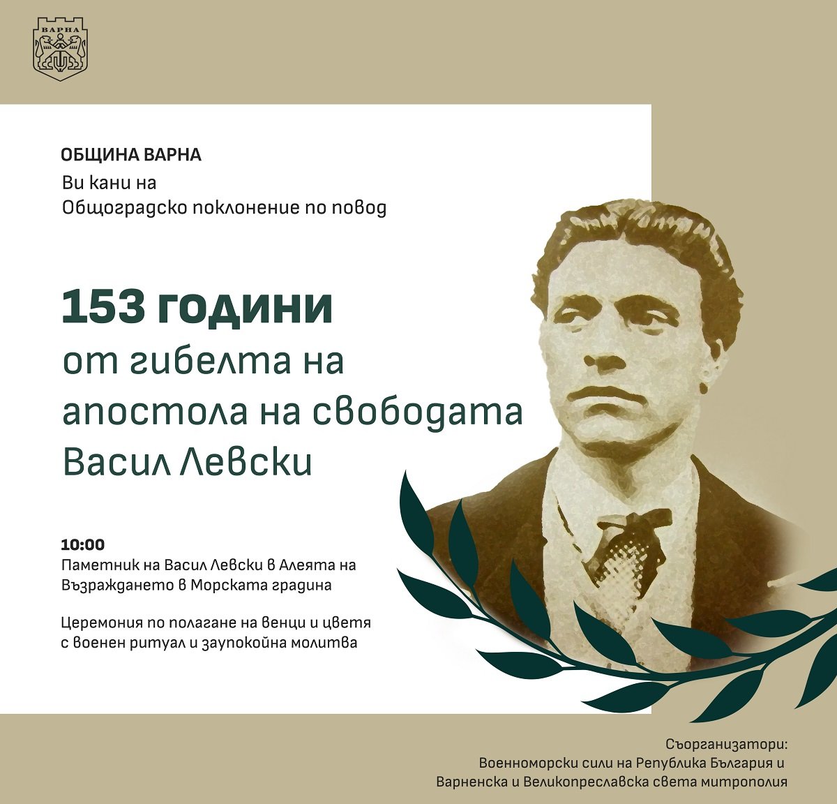 Община Варна организира общоградско поклонение, с което ще бъдат отбелязани 153 години от гибелта на Апостола на свободата Васил Левски. За втора поредна година събитието ще се проведе на 18 февруари от 10:00 ч. пред паметника на Левски в Алеята на Възраждането в Морската градина. Ще бъдат положени венци и цветя с военен ритуал и ще бъде отслужена заупокойна молитва. Съорганизатори са Военноморските сили на Република България и Варненската и Великопреславска света митрополия.