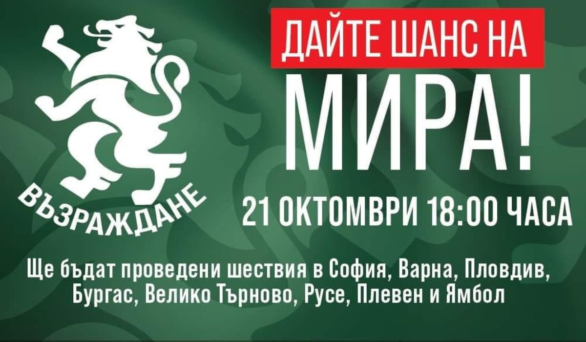 Днес в 18 ч. “Възраждане“ организира национална акция „Дайте шанс на мира!”. Тя ще бъде проведена едновременно в осем града на страната – София, Варна, Пловдив, Бургас, Велико Търново, Русе, Плевен и Ямбол. Така “Възраждане”, единствената политическа сила в България, която защитава мира, ще изкаже своята позиция за неговото запазване в България. От “Възраждане” са категорични, че страната ни не бива да бъде въвличана в никакви военни конфликти. Дори и да не ни засегне пряко, войната вероятно ще предизвика огромни бежански потоци. Слеят ли се с милионите нелегални емигранти в Турция, ще предизвикат потоп по границата ни. Единствените, които от години предлагаме трайно разполагането на войската, която да защитава границата ни, сме ние от „Възраждане“.