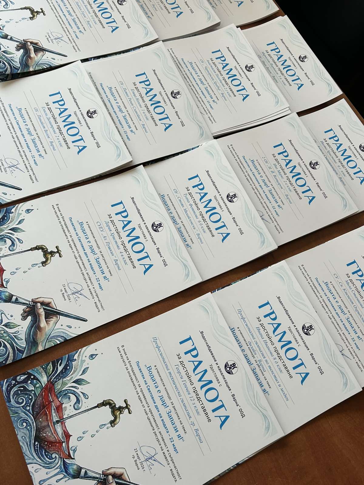 230 грамоти бяха изпратени на всички деца, взели участие в конкурса на „Водоснабдяване и канализация – Варна“ ООД, посветен на Световния ден на водата – „Водата е дар! Запази я!“. Той премина при огромен интерес и активно участие от учениците в 45 училища т Варна и областта. Наградени бяха 24 деца в три възрастови категории – три първи, три втори и три трети награди и 15 поощрителни, три от които получиха и специалната награда на арт галерия „Папийон“.
