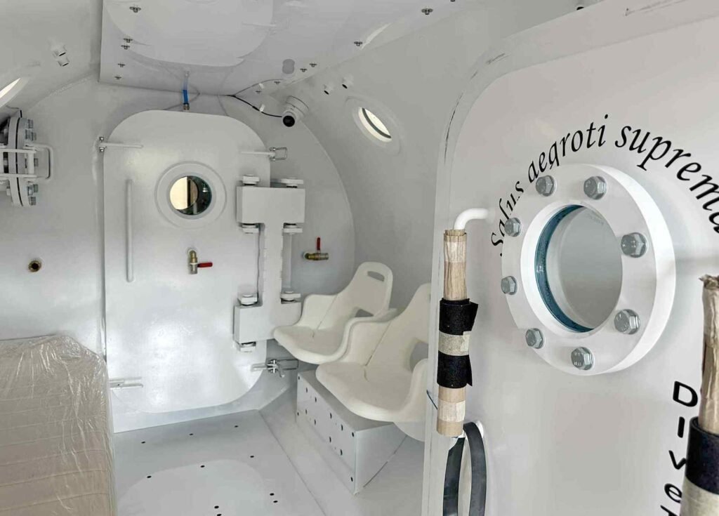 Новата барокамера е двуотсечна, с независими налягания и по шест кислородни маски във всеки отсек. Тя позволява по-голям капацитет за лечение, едновременно протичане на различни терапии и безпрепятствен достъп на медицински персонал. Осигурява комфорт чрез просторен интериор с илюминатори, телевизори, аудиосистема, климатична система и двупосочна аудиовръзка с лекар.