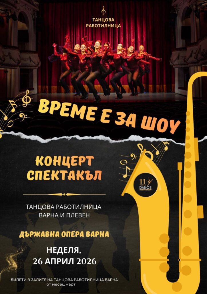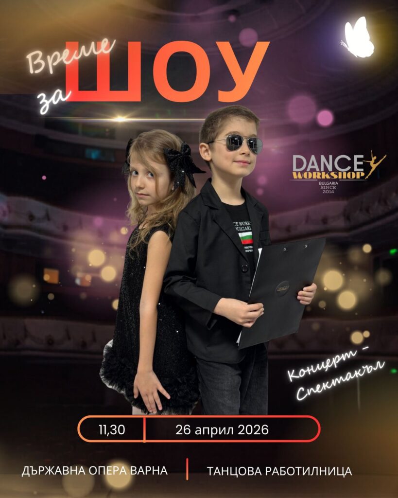На 26 април 2026 г. в Държавна опера – Варна от 11:30 ч. ще бъде представен мащабният годишен концерт-спектакъл „ВРЕМЕ Е ЗА ШОУ“ на ТАНЦОВА РАБОТИЛНИЦА – школа за танцово изкуство с дейност в градовете Варна и Плевен.