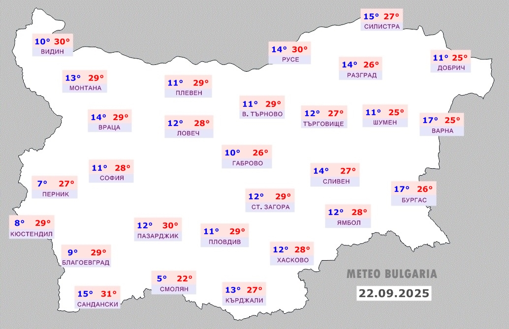 Прогнозата на Meteo Bulgaria за понеделник, 22 септември, предвижда без промяна на времето. Нощта ще бъде ясна, в котловините – тиха, а в останалата част от страната ще духа слаб североизточен вятър. В Предбалкана и Лудогорието ще се усеща югоизточен полъх.