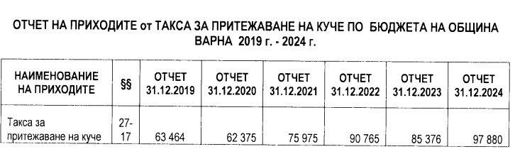 С всяка изминала година се увеличават приходите, които постъпват в общинския бюджет във Варна от таксата за притежаване на куче. Това става ясно от отговор на зам.-кмета Христо Рафаилов, по повод отправен въпрос от страна на общинския съветник Павел Раличков, научи TheSite24. Не е ясно обаче как се разпределят тези средства, тъй като местата за разхождане на домашните любимци в града са малко, а съвестните стопани все повече. От справката, която е представена към отговора става ясно, че за 2024 г. в община Варна са платени 97 880 лв. такси за притежаване на домашно куче. Това е близо 50% от 2019 година, когато са събрани 63 хил. лв.