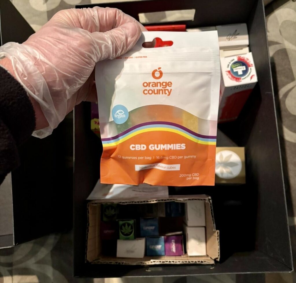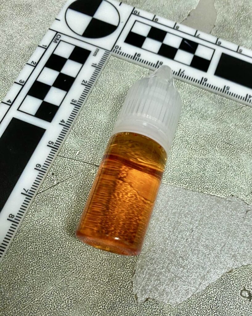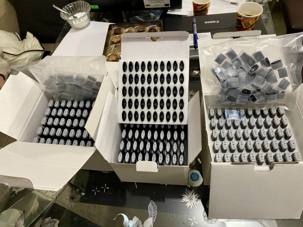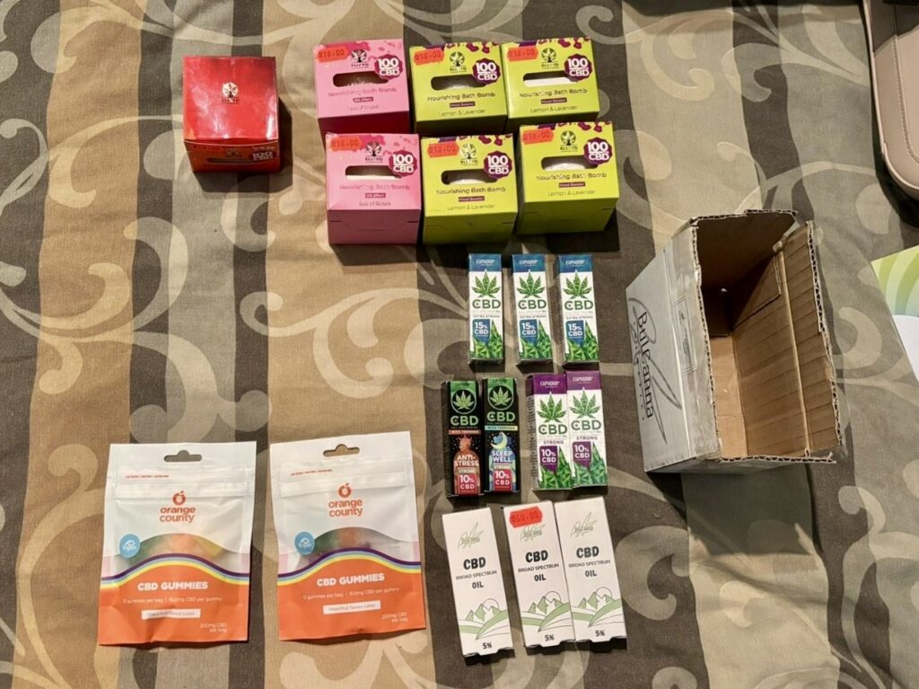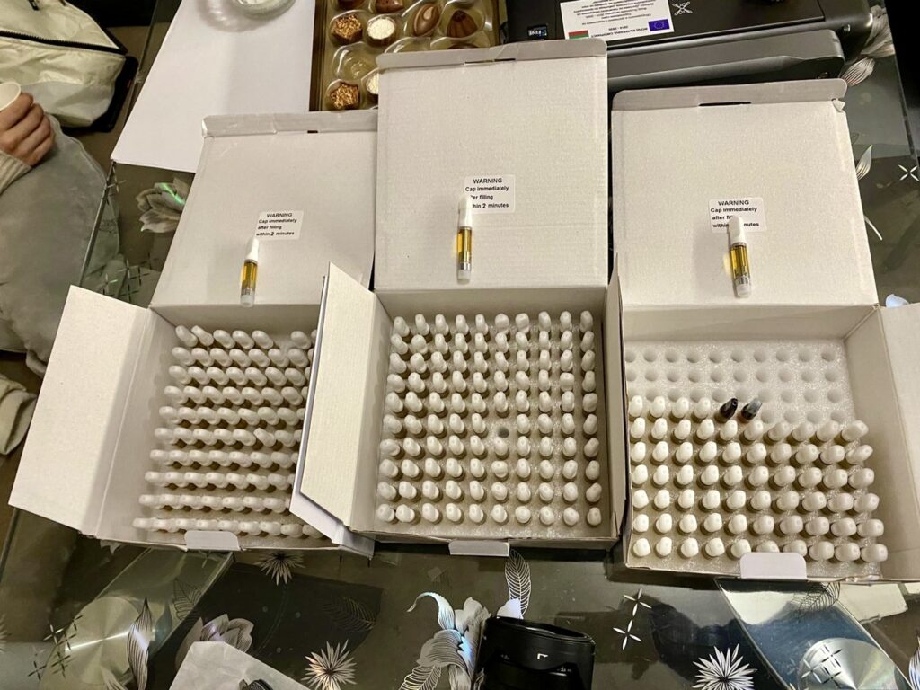 При извършените претърсвания на 14 имота и 2 автомобила са иззети голям брой веществени доказателства: метална бутилка с тегло 1140 грама, съдържаща твърдо смолисто вещество, реагирало на канабиноид, 389 пълнители с вместимост 1 мл с течност, съдържаща канабиноид, 72 електронни цигари (вейп) с течност с канабиноид, две капсули от по 10 мл, съдържащи същата субстанция. Установени са още 130 грама марихуана, 16 пакетчета чай, съдържащ CBD, козметика и соли за вана с канабиноиди, множество празни пълнители за електронни цигари и капсули, както и консумативи за приготвянето им – чаши, спринцовки, аромати, терпен, електронна везна, както и товарителници за пратки и документи, които имат отношение към воденото производство.