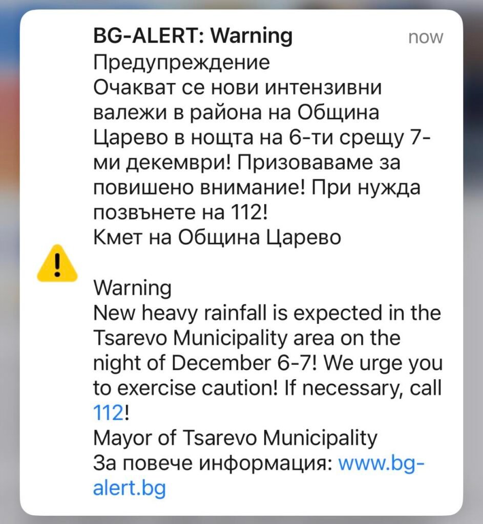 И кметът на Община Царево задейства системата BG-ALERT с предупреждение за очаквани нови интензивни валежи през нощта.