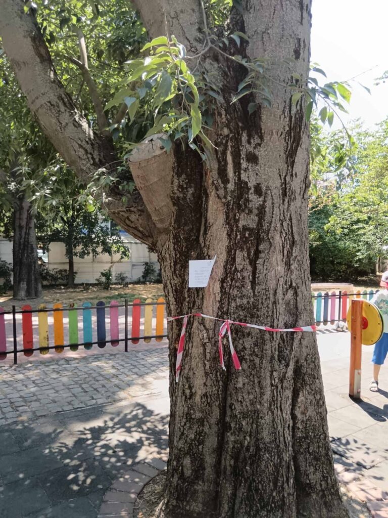 Опасните дървета се намират в зоната на детската площадка, която вече е обезопасена със сигнални ленти и информационни съобщения, съобщиха от районната администрация.