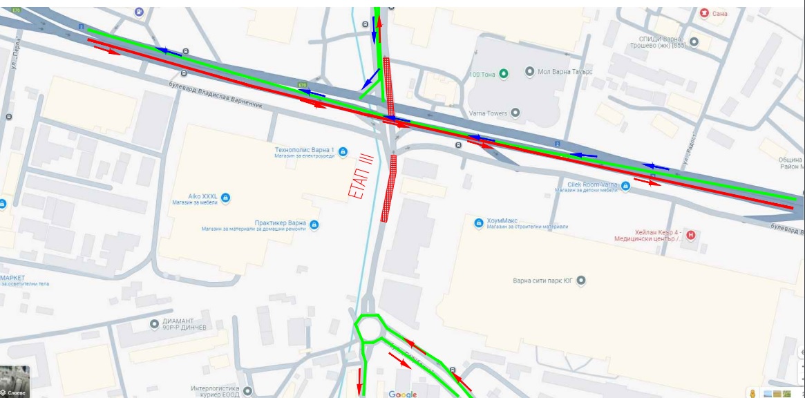 Движението по бул. „Владислав Варненчик“ в района на обекта става двупосочно в свободното от строителни работи платно