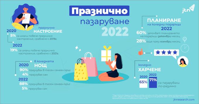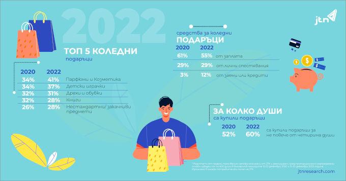 Допълнителен индикатор за по-рационалното пазаруване е ръстът с 8% на хората, които са купили подарък за не повече от четирима души. Освен това, ако през 2020г. повечето анкетирани са разчитали на лични доходи и спестявания, за да покрият разходите си за подаръци, то през 2022 делът на хората, които са използвали кредит или заем се увеличава 4 пъти – от 3% през 2020г сега те са цели 12%.