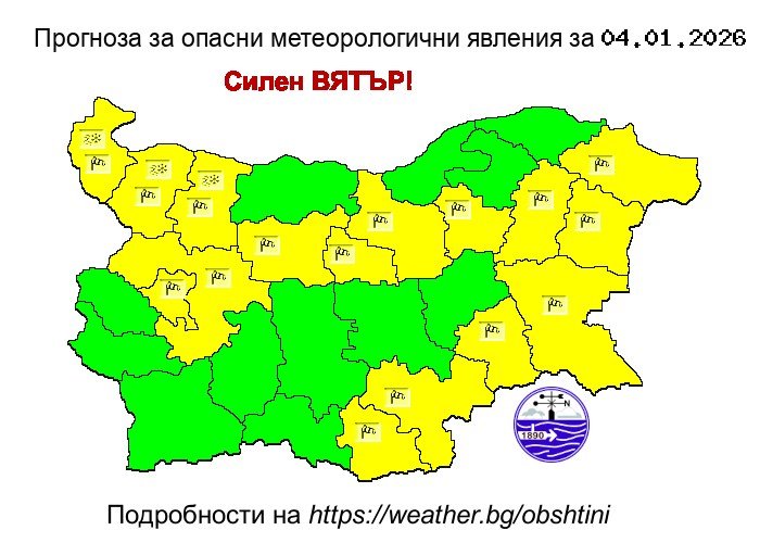 За 4 януари 2026 г. Националният институт по метеорология и хидрология издава предупреждение от първа степен (жълт код) за опасни метеорологични явления в редица области на страната.