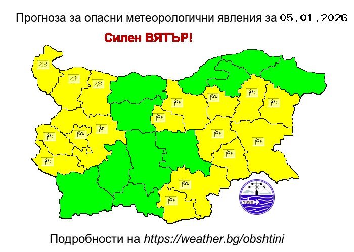 Жълт код за силен южен вятър с пориви 20–22 m/s е в сила за областите Кърджали, Хасково, Ямбол, Сливен, Бургас, Варна, Шумен, Търговище, София, София-област, Перник, Кюстендил, както и за южните части на Велико Търново и Габрово.