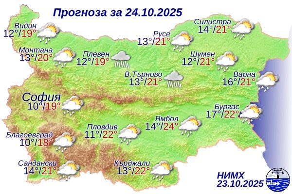 В петък денят ще започне с облачно време и валежи, които ще се придвижват от запад на изток. След обяд дъждът постепенно ще спира — най-късно в югоизточните райони, а облачността ще започне да се разкъсва. Ще остане ветровито. Вятърът ще се ориентира от запад-северозапад и ще се усили, особено в Дунавската равнина и Горнотракийската низина. Максималните температури ще достигат между 19° и 24°, за София — около 19°.