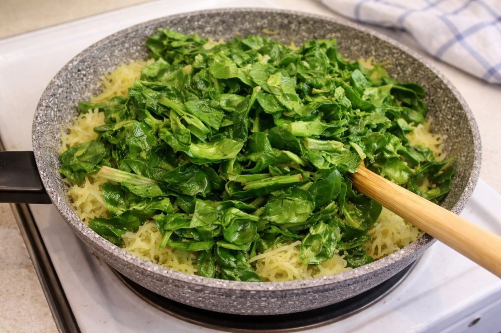 Нарежете спанака. Добавете половината към картофите, разбъркайте, след което сложете и останалия спанак, солта и пипера. Гответе около 4 минути.