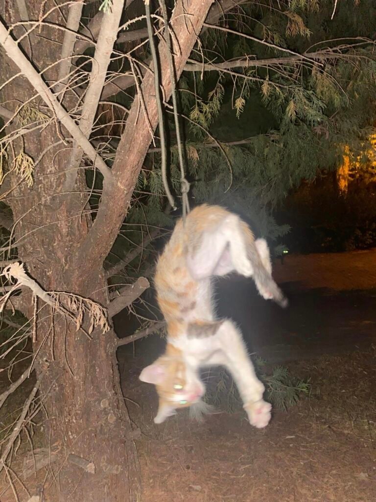 Не е ясно, колко време животинката е висяла от клона, но човекът, който е открил поредната жертва на насилие споделя, че въжето е било толкова здраво увито, че тялото на котето е било цялото в кръв. По чудо обаче малкият боец оцелява, въпреки горещината и кръвозагубата.